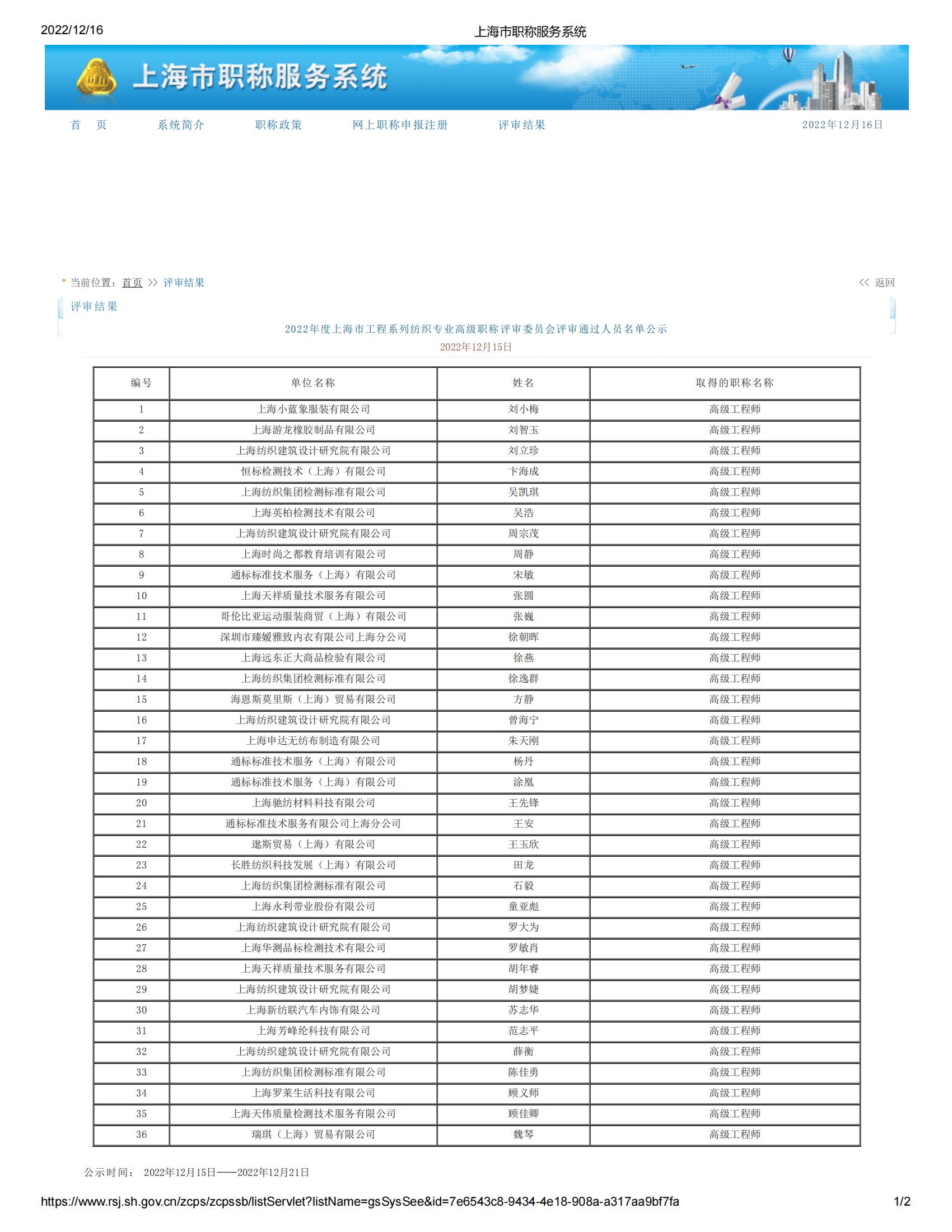 2022年度上海市工程系列紡織專業(yè)高級(jí)職稱評(píng)審委員會(huì)評(píng)審?fù)ㄟ^人員名單公示